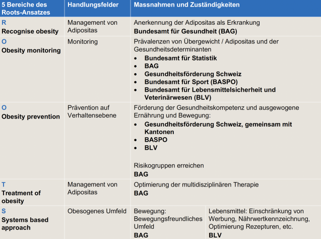 Die Umsetzung der international empfohlenen Massnahmen in der Schweiz lassen sich anhand des sogenannten «Roots»-Ansatz darstellen, entwickelt vom Globalen Adipositasforum im Jahre 2020 (siehe Grafik). Der Ansatz umfasst fünf Handlungsfelder: