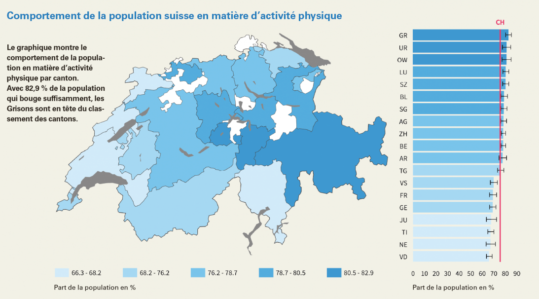 Le système MonAM permet bien sûr aussi d’obtenir des réponses aux questions soulevées en introduction : avec 82,9 % d’habitants qui ont une activité physique suffisante, les Grisons arrivent en tête du classement des cantons. Notons cependant que même dans le peloton de queue – c’est-à-dire dans les cantons de Vaud, de Neuchâtel, du Tessin et du Jura – deux tiers de la population font au moins deux heures et demie d’activité physique par semaine. À l’échelle de tout le territoire suisse, la part de la population physiquement active a augmenté de 62,2 % à 75,7 % entre 2002 et 2017.