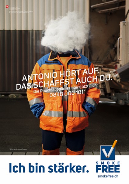 Das Thema Tabak sorgt für rauchende Köpfe. Am Stammtisch, in der Politik – und nun auch in der Tabakpräventionskampagne «SmokeFree». Für viele aufhörwillige Rauchende steht die Umsetzung des Rauchstopps aber buchstäblich in den Wolken. Die Kampagne will mit von Wolken umgebenen Köpfen auf Plakaten, in Inseraten und TV-Spots für die Gefahren des Tabakkonsums sensibilisieren. Die Rauchenden werden auf existierende Unterstützungsangebote aufmerksam gemacht – etwa die Rauchstopplinie unter Telefon 0848 000 181. Mehr als die Hälfte der Rauchenden geben nämlich an, das Rauchen aufgeben zu wollen. Oft mangelt es aber am konkreten Entschluss. Das Verdrängen und die Handlungsohnmacht sollen überwunden und die Ausstiegsmotivation mit konkreten Hilfestellungen gestärkt werden. Die Kampagne motiviert und unterstützt Aufhörwillige und ihr Umfeld dabei. Ihre Kernbotschaft lautet: «Rauchfreiheit lohnt sich. Du hast es in der Hand. Mach den ersten Schritt. Wir helfen dir dabei.» Aufhörwillige sollen bei Bedarf Hilfe in Anspruch nehmen. Denn der Rauchstopp ist erfolgreicher, wenn er durch fachliche Unterstützung begleitet wird.