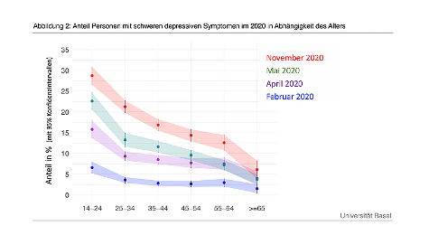 Die neueste Corona Stress Study (im preprint) wurde zwischen dem 8. und 24. März 2021 bei 393 Studierenden zwischen 16 und 19 Jahren der Nordwestschweiz durchgeführt. Sie zeigt, dass die psychische Belastung im März 2021 immer noch hoch geblieben ist. Der Anteil Jugendlicher mit mittelschweren und schweren depressiven Symptomen beträgt mit 27 Prozent gut ein Viertel. Als gewichtigste Faktoren werden Schuldruck, Sorgen um eine schlechtere Ausbildung und geringere berufliche Chancen sowie Angst um eine Beschädigung des sozialen Netzwerks genannt. Schülerinnen und Schüler, die angaben, dass der Schuldruck durch die Pandemie grösser geworden sei, berichteten auch verstärkt von depressiven Symptomen.