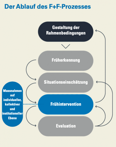 Der F+F-Ansatz bedeutet daher, sich nicht nur auf die Person zu konzentrieren, sondern auch auf das Umfeld, in dem sie lebt. Die Entwicklung eines gesundheitsförderlichen Umfelds ist zentral. Es ist wenig zielführend, eine schwierige Situation frühzeitig zu erkennen, die Person mit individuellen Massnahmen zu unterstützen und sie dann wieder in einen potenziell schädlichen Kontext zu entlassen. Aus diesem Grund versteht sich der F+F-Ansatz als ganzheitlicher Ansatz, der einen Bogen von der Gesundheitsförderung bis hin zur Betreuung spannt.