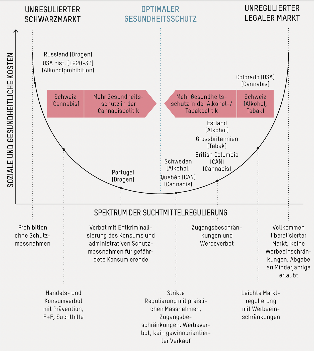 Im Hinblick auf die parlamentarischen Bestrebungen zur Regelung eines legalen Cannabismarkts hat der Bundesrat in seinem Bericht aufgezeigt, wie ein solches Vorhaben umgesetzt werden könnte. Dabei stützt er sich auch auf die internationalen Erfahrungen bei der Regulierung von Suchtmitteln. Das Spektrum reicht von einer strikten Prohibition mit unkontrolliertem Schwarzmarkt bis zu einem weitgehend liberalisierten Markt ohne griffige Gesundheitsschutzmassnahmen (siehe Grafik). Zwischen diesen problematischen Extremen gibt es Ansätze der Entkriminalisierung, des nicht-gewinnorientierten Verkaufs und der strikten Marktregulierung, die sich in verschiedenen Ländern bewährt haben.