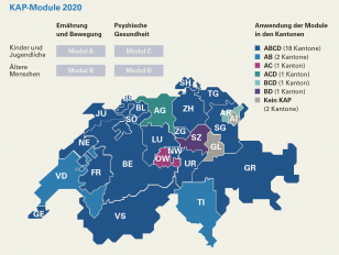 Gesundheitsförderung Schweiz (GFCH) setzt zusammen mit 24 Kantonen Kantonale Aktionsprogramme (KAP) um. Die Idee: Kinder, Jugendliche und ältere Menschen sollen sich ausgewogen ernähren, mehr bewegen und psychisch gesund bleiben....