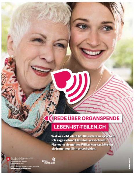 Organspende. Eine Befragung des Bundesamtes für Gesundheit (BAG) im Jahr 2015 zeigte, dass die Mehrheit der Schweizer Bevölkerung grundsätzlich bereit ist, Organe zu spenden. Dennoch gibt es einen grossen Mangel an gespendeten Organen. Ein Grund für diese Lücke liegt in der hohen Ablehnungsrate durch die Angehörigen, die in der Schweiz mit über 60 Prozent im europäischen Vergleich sehr hoch ist. Die Kampagne «Rede über Organspende», die das BAG gemeinsam mit der Stiftung Swisstransplant im September 2016 lanciert hat, zielt darauf ab, dass mehr Angehörige den Entscheid ihrer Liebsten kennen.