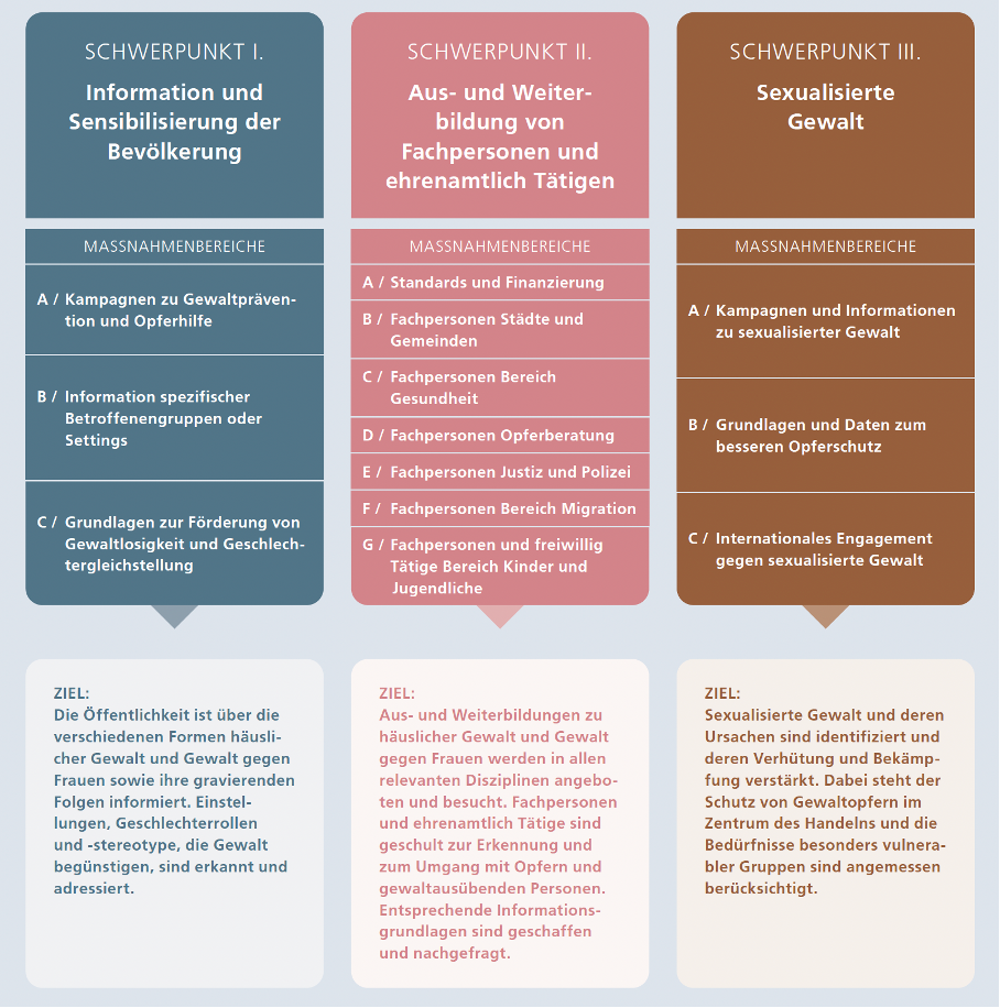 Mit der Ratifizierung der Istanbul-Konvention im Jahr 2017 hat sich die Schweiz verpflichtet, häusliche Gewalt und Gewalt gegen Frauen zu verhindern und zu bekämpfen und Opfer angemessen zu versorgen und zu unterstützen. Um diese Ziele zu erreichen, haben Bund und Kantone im Jahr 2022 den «Nationalen Aktionsplan der Schweiz zur Umsetzung der Istanbul-Konvention 2022-2026» verabschiedet. Er enthält Massnahmen in drei Bereichen: In der Information und Sensibilisierung der Bevölkerung, in der Aus- und Weiterbildung von Fachpersonen und im Bereich sexualisierte Gewalt.