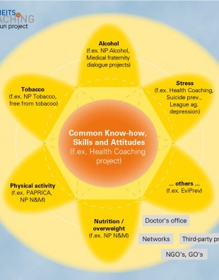 Implementation of the NCD strategy does not involve re-inventing the whole approach to prevention. However, tried and tested projects should increasingly incorporate additional risk factors if possible, including not only risk factors for NCDs but also those related to addiction and mental health. Innovative projects and programmes that demonstrate how prevention can be better integrated into healthcare need to be supported, improved and promoted more strongly (nationwide if possible) in the context of the NCD strategy. In order that healthcare providers participate in prevention covered by mandatory health insurance, financial incentives for health insurers could be created as an alternative to the existing fee-for-service model. In fact, payers and healthcare providers are being encouraged to develop innovative financing models in this area. Prevention projects are currently supported by Health Promotion Switzerland, the Swiss Tobacco Prevention Fund and the Alkoholzehntel ['Alcohol 10 %' – a Swiss cantonal alcohol prevention fund].