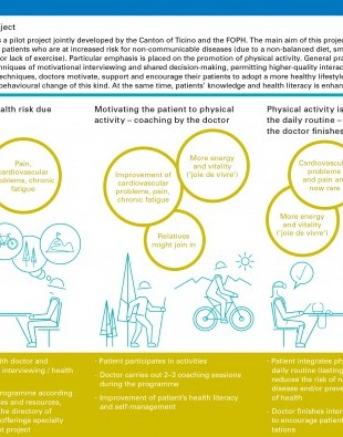 How can prevention and healthcare promotion be properly integrated into the healthcare system? The Federal Office of Public Health is developing model healthcare pathways together with stakeholders from the healthcare system, service providers, educational institutions and other expert committees. At the right moment, patients are linked with the relevant professionals by means of these defined pathways. These models are derived from the chronic care model (CCM) and/ or the expanded chronic care model. The model used in the care of chronically ill patients is designed to incorporate several areas in the treatment – effectively and in accordance with the patient's needs. The expanded chronic care model goes one step further, and combines prevention and health promotion more consistently with healthcare. In this case, interprofessional teams (i.e. not just clinically oriented individuals) support chronically ill people with their problems, including those that affect their everyday lives. They may clarify issues relating to healthcare, social isolation or mobility. This approach is intended to significantly improve patient health in the long term. Such continual support also makes it easier to detect signs of dementia or mental health problems. It also means that patients automatically play an active role in their treatment, which in turn improves their self-management and their ability to take responsibility for themselves.