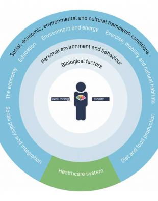 The primary source of health is our everyday environment – in other words the places where we live, learn, eat, play, ride bikes, work and love. People’s health is influenced by a large number of different factors known as determinants of health (see illustration). The first of these are personal determinants, such as inherited dispositions, social environment and individual health-related behaviours. However, social, economic and environmental conditions also have a direct or indirect influence on health. Specifically, we are talking here about determinants such as income, education or air pollution.