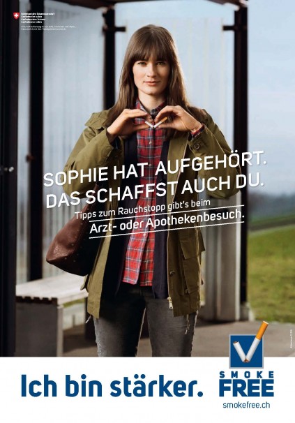 Gemeinsam mit Kantonen und NGOs hat das BAG im Jahr 2015 eine neue SmokeFree- Kampagne lanciert mit dem motivierenden Slogan «Ich bin stärker.». Während im ersten Kampagnenjahr die Wolke um die Köpfe als augenfälliges Sinnbild auf die Problematik des Rauchens aufmerksam machte, hat sich die Wolke im Jahr 2016 verzogen. In TV-Spots, auf Anzeigen und Plakaten sind nun die Gesichter der zuvor verhüllten Personen zu sehen, zusammen mit der geknickten Zigarette in den Händen, als Symbol für den erfolgreich geschafften Rauchstopp.