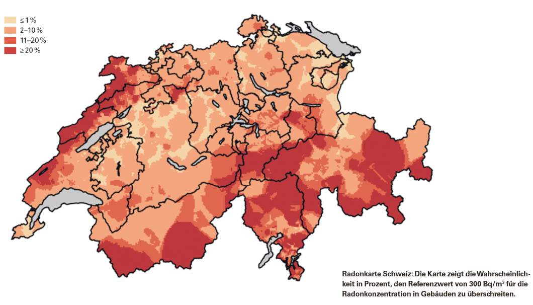 Radon entsteht beim natürlichen Zerfall von Uran im Boden. Es kann aus dem Boden aufsteigen und über Risse, Fugen oder Öffnungen für Kabel in den Wänden in Häuser gelangen. Werden die Folgeprodukte von Radon eingeatmet, können sie sich auf dem Lungengewebe ablagern und dieses radioaktiv bestrahlen. Dies kann zu Lungenkrebs führen. In der Schweiz verursacht Radon bei mehr als 10 Prozent der gemessenen Gebäude ein übermässiges Gesundheitsrisiko, vor allem im Jura und in den Alpen.