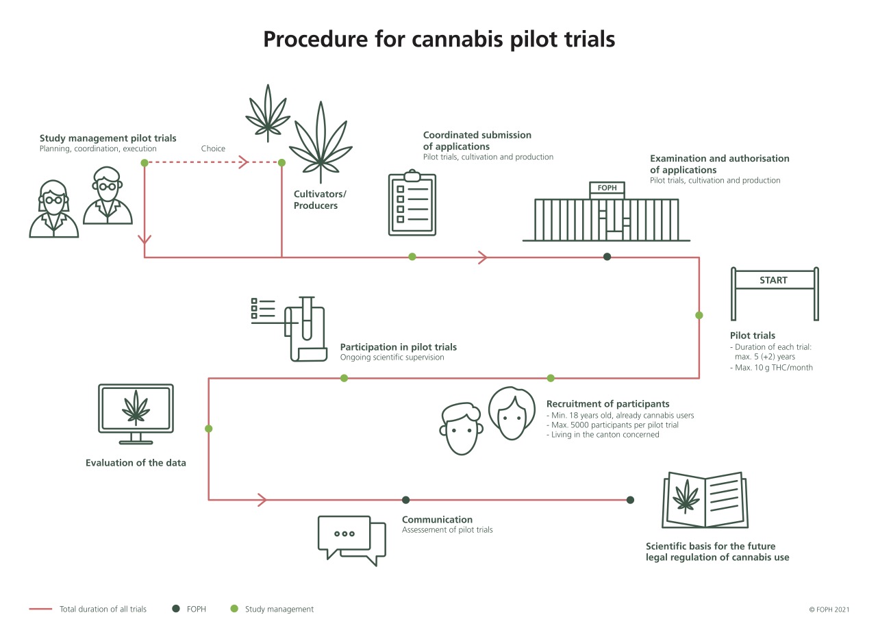 A number of cannabis pilot trials have been started since early 2023 with the aim of creating a scientific basis for future legal regulation. The pilot trials are being planned and performed on the initiative of various stakeholders, among them cities and municipalities, and require approval from the Federal Office of Public Health (FOPH).