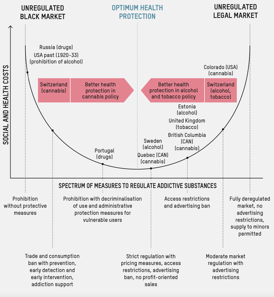 The spectrum of measures to regulate addictive substances ranges from a ban with no measures to protect health to an unregulated legal market.The social and health costs are highest at the two extremes with an unregulated market. Show graphic