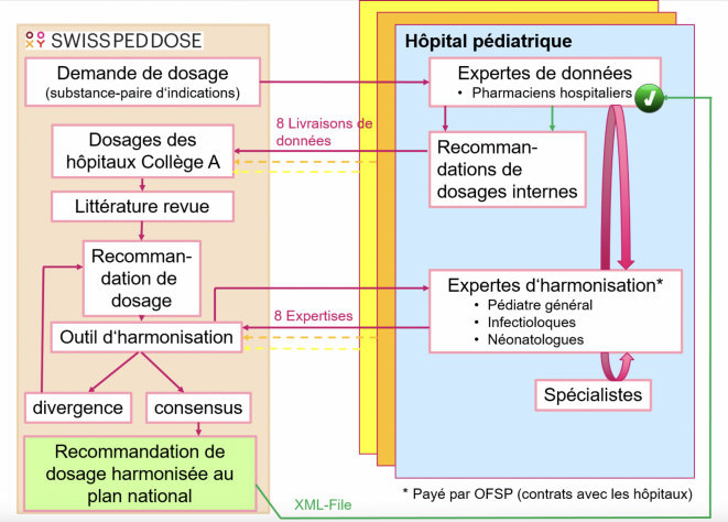 L’association SwissPedDose est formée de huit cliniques pédiatriques (Aarau, Bâle, Berne, Genève, Lausanne, Lucerne, St-Gall et Zurich), de la Société suisse de pédiatrie (SSP) et de l’Association suisse des pharmaciens de l’administration et des hôpitaux (GSASA). Elle est financée par la Confédération.