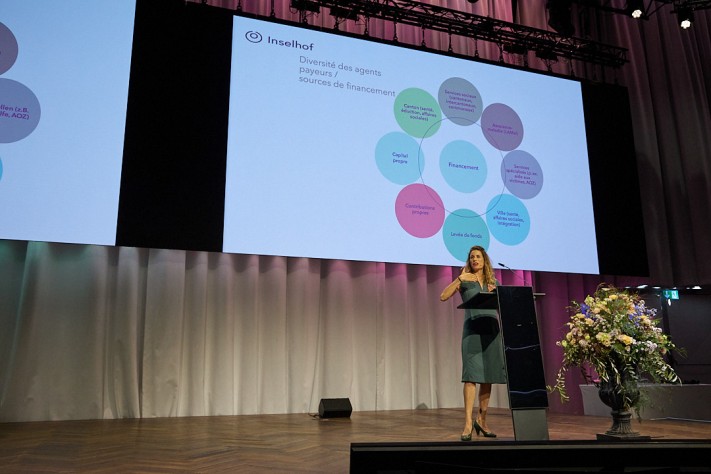 Ursula Koch estime que l’Inselhof est forcément confronté à des défis relevant du domaine social et de la santé. Selon elle, les raisons de recourir au centre sont multiples. « Il s’agit d’une part de garantir le bien-être de l’enfant en cas de violence, de négligence, de séjour en prison de la mère, d’addiction ou autre ». Elle explique en outre que la sécurité de la mère est un thème récurrent et que celle-ci doit être garantie par le personnel de sécurité (ce qui engendre aussi des coûts). L’Inselhof possède aujourd’hui une large palette d’offres complémentaires, ce qui lui donne la possibilité de répondre de manière rapide et flexible aux besoins de l’enfant et de son système familial, en particulier de la mère. Environ 130 personnes travaillent à l’Inselhof. Elles sont notamment issues de la pédagogie sociale, de la psychologie, de la psychiatrie, de la prise en charge, des soins et de l’économie domestique. L’ensemble des gestionnaires de cas ont en outre suivi une formation continue en pédagogie du traumatisme. « Cette prise en charge requiert un financement mixte complexe. Étant donné la fragmentation du système et l’absence de bases légales pour le financement ou d’efforts de coordination légale, le travail dans cette offre interprofessionnelle et interdisciplinaire est très compliqué. C’est ce qu’a expliqué Ursula Koch lors de son exposé, durant lequel elle a présenté le nombre impressionnant de parties prenantes.