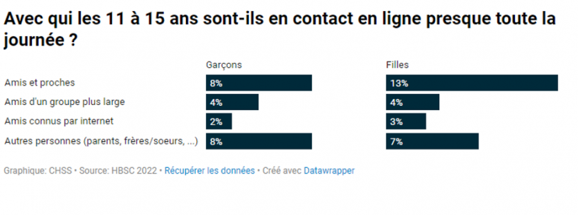 - En 2022, en Suisse, environ 82 % des jeunes de 11 à 15 ans étaient en ligne chaque jour, que ce soit pour se divertir, communiquer, apprendre ou s’informer.