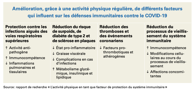 L’activité physique régulière d’intensité moyenne à élevée a un effet protecteur supplémentaire contre les maladies infectieuses et notamment contre la grippe et le COVID-19. Aux États-Unis, des scientifiques ont découvert que, face au COVID-19, les patients physiquement inactifs présentent un risque d’hospitalisation 2,26 fois plus élevé que les personnes qui ont une activité physique régulière. Par ailleurs, la probabilité qu’ils aient besoin d’un traitement en soins intensifs et leur risque de décès sont respectivement 1,73 fois et 2,49 fois plus importants. De plus, il apparaît que l’activité physique d’intensité moyenne réduit l’incidence et la durée des infections des voies respiratoires, et ce plus fortement que les médicaments ou les compléments alimentaires.