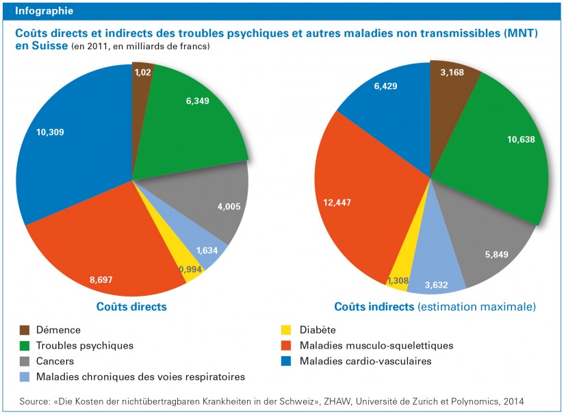Infographisme. Source: «Die Kosten der nichtübertragbaren Krankheiten in der Schweiz», ZHAW, Université de Zurich et Polynomics, 2014