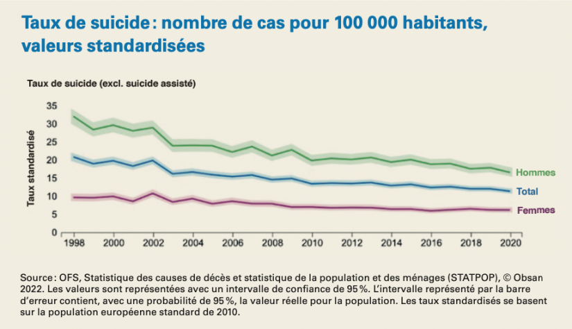 Qu’en est-il de la suicidalité en Suisse? Quelles sont les mesures déployant leurs effets, et où reste-t-il beaucoup à faire? Il est impossible de le savoir sans données exhaustives. Les données les plus complètes sont publiées chaque année par l’Office fédéral de la statistique (OFS), dans le cadre de sa statistique des causes de décès. On peut ainsi déterminer le taux de suicide, qui prend en compte l’évolution démographique. Celui-ci a tendance à diminuer – conformément à l’objectif du plan d’action de réduire le taux de suicide de 25% d’ici à 2030. Ce recul n’est toutefois pas homogène. Depuis 2013, il est notamment bien plus marqué au sein de la population masculine, évolution que confirment les derniers chiffres sur l’année 2020.*1