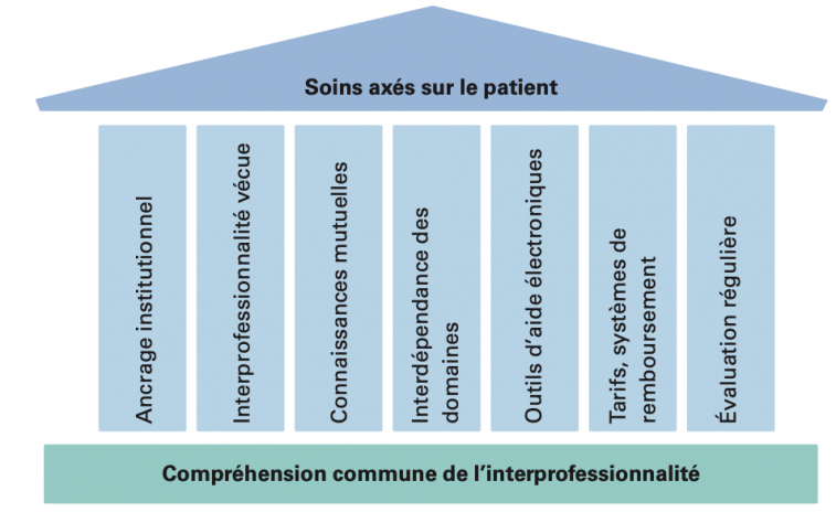 La collaboration interprofessionnelle (CIP) contribue de manière essentielle à atteindre ces deux objectifs. Des études montrent que la CIP a un impact direct sur la qualité des soins, car elle permet de se concentrer sur les besoins des patients et optimise la coordination entre les différents professionnels. En améliorant la satisfaction que les professionnels tirent de leur travail, elle influe aussi indirectement sur la qualité des soins, puisqu’au lieu de respecter une hiérarchie rigide, les membres des équipes interprofessionnelles collaborent davantage les uns avec les autres, d’égal à égal. Le personnel qualifié reste ainsi en poste plus longtemps, ce qui a des répercussions positives sur la continuité des soins et donc sur la qualité des prestations. Mais la CIP contribue aussi à augmenter l’efficacité du système de santé en permettant notamment de mieux éviter les doublons grâce à l’action coordonnée des professionnels, qui forment une unité.
