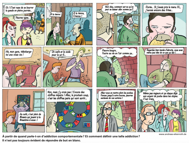 Qu’est-ce qu’une addiction comportementale  Formuler une définition n’est pas si simple. Une personne qui joue chaque semaine au casino, passe six heures par jour à jouer à la Playstation ou aime beaucoup acheter des vêtements sur Internet est-elle dépendante  Une addiction comportementale se caractérise par le fait qu’une chose qui faisait auparavant partie du quotidien occupe subitement une place prépondérante  la vie de la personne touchée tourne de plus en plus autour de l’objet de la dépendance, si bien qu’elle néglige ses amis, sa famille et son travail. Un besoin irrépressible s’installe, il en faut toujours plus. La personne ne peut plus s’arrêter, même si son compte en banque est vide depuis longtemps.